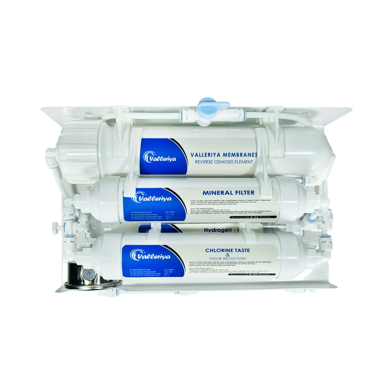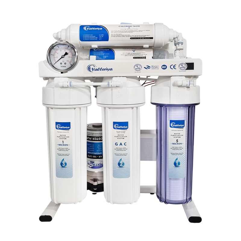 دستگاه تصفیه آب والریا مدل UK7 دارای ۷ مرحله فیلتراسیون می باشد. این سیستم از روش اسمز معکوس جهت فیلتراسیون بهره گرفته است و دارای پمپ پر قدرت و سایلنت آکسترون مدل AX-100GPD با ظرفیت ۱۰۰ گالن و فشار ماکزیمم ۱۴۰PSI می باشد. وجود مخزن ذخیره ۵ گالن سه لایه، آنتی باکتریال از برند تانک پک تایوان از مزیت های این سیستم می باشد. دستگاه تصفیه آب والریا مدل UK7 دارای هوزینگ های پیش تصفیه دوبل اورینگ ارگانیک تایوان، هوزینگ ممبران تانک پک تایوان، آداپتور اورجینال تمام مس تایوان، اتصالات کوئیک کانکت فیتینگی نسل سوم برند جت سان تایوان، شیر برقی تمام مس و سوئیچهای لوپرشر و هایپرشر جت سان تایوان، شیر برداشت اهرمی استیل سنگین وزن تایوان، پک نصب کامل شامل اتصالات انشعاب از آب شهری به صورت برنجی، آچار تعویض فیلترها، بست کمربندی خروجی فاضلاب، شیر مخزن، دفترچه زمان بندی تعویض فیلتر ها و شش متر شلنگ می باشد.
